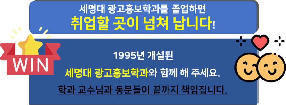 본문 시작 홈으로 매력적인 학과소개 매력적인 학과소개 흥미로운 교육과정 특별CC프로그램 We can 취업 따뜻한 커뮤니티 홈페이지가이드 지금 우리 광홍은 학과개요 학과연혁 교수소개 Wilco로 보는광고홍보학과 지금 우리 광홍은 지금 우리 광홍은 페이스북 트위터 프린트 [취업현황]우리 광홍 취업은 광고홍보학과 3541 2024-09-13 우리 광홍은 취업률이 좋습니다. 최근 취업률이 70% 이상을 기록하고 있습니다. * 1995년 개설된 '역사'와 '전통', '역량'을 가진 우리 광홍 여러분의 취업과 성공을 학과는 기도하고 돕겠습니다. "기획맛집" 세명대 광고홍보학과!! 기획력이 경쟁력이다~. 목록 이전[수상]2024코삭챌린저상 다음 [경축]2025대한민국 대학생 광고대회 '최우수상'수상_대전충청지역대회