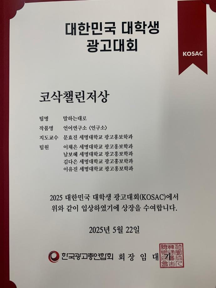 본문 시작 홈으로 매력적인 학과소개 매력적인 학과소개 흥미로운 교육과정 특별CC프로그램 We can 취업 따뜻한 커뮤니티 홈페이지가이드 지금 우리 광홍은 학과개요 학과연혁 교수소개 Wilco로 보는광고홍보학과 지금 우리 광홍은 지금 우리 광홍은 페이스북 트위터 프린트 2025KOSAC_트로피_상장 광고홍보학과 1230 2025-08-01 <2025년 대한민국 대학생 광고대회>에서 좋은 성적을 거둔 우리 학생들 축하해요. ^^ 금상 트로피가 학과에 왔네요. 그리고 챌린저상 수상 소식도 계속 들려오고 있네요. 모든 학생들의 열정과 노력에 감사합니다. : ) *크리에이티브 기획맛집 세명대 광고홍보학과! 목록 이전[경축]2025 KOSAC 전국대회 금상 다음 2025 Creative Challenge 공모전