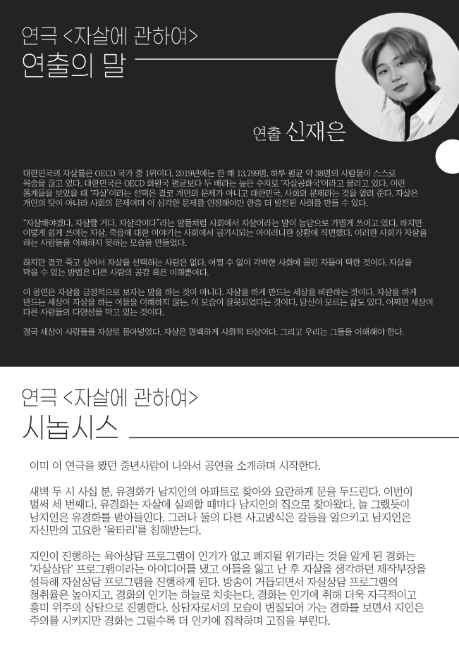 본문 시작 홈으로 학과과정 학과소개 입학정보 교수소개 학과과정 커뮤니티 공연예매 안내 홈페이지가이드 비교과프로그램 교육과정 전공교육 체계도 비교과프로그램 MOU 체결 하계, 동계 프로젝트 하계, 동계 프로젝트 연극놀이 지도사 양성 교육 현장실습 프로그램 액팅플러스 하계, 동계 프로젝트 페이스북 트위터 프린트 2021학년도 동계 프로젝트 ‘자살에 관하여’ 연기예술학과 2468 2021-03-26 목록 다음 2021학년도 동계 프로젝트 ‘넥스트 투 노멀’ 다음 2021학년도 동계 프로젝트 ‘오아시스 세탁소 습격사건’ 만족도조사 만족도 조사 이 페이지에서 제공하는 정보에 대하여 만족하시나요? 매우만족 만족 보통 불만족 매우불만족