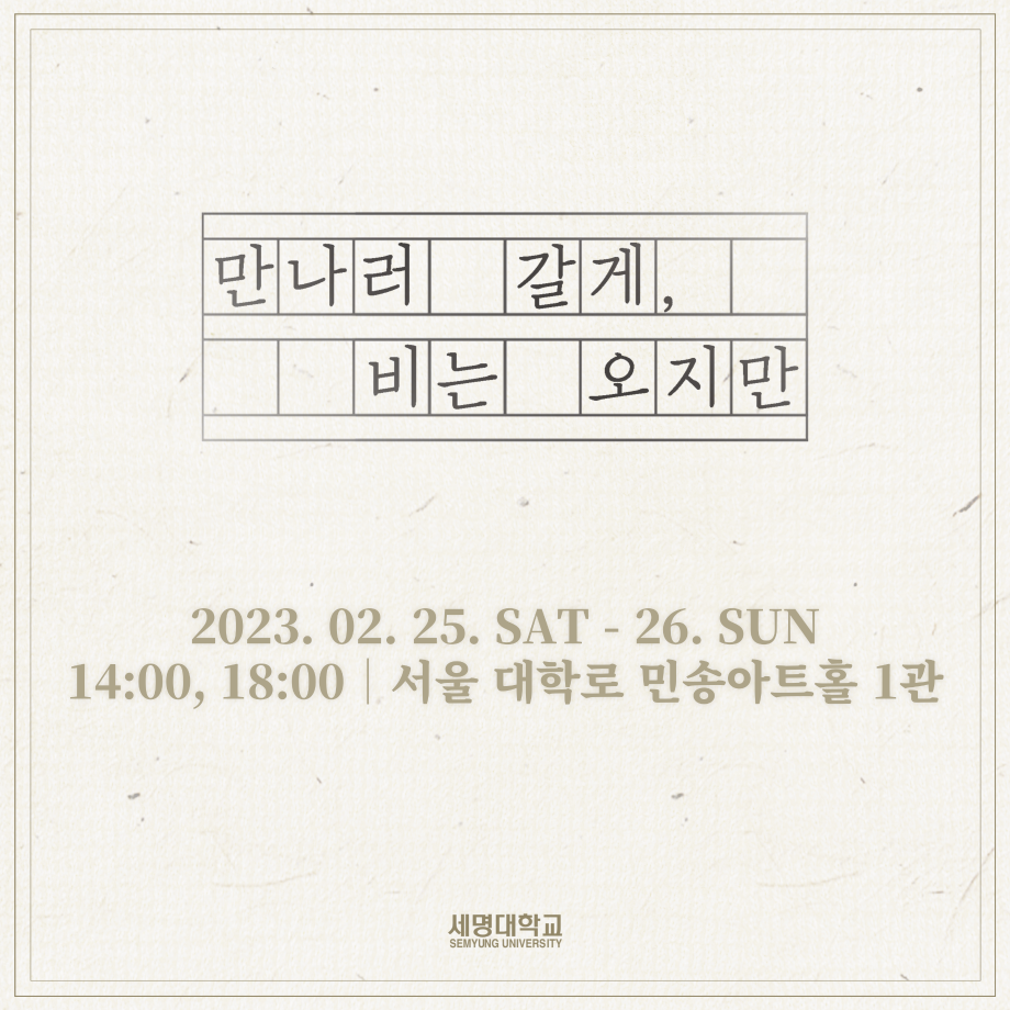 본문 시작 홈으로 학과과정 학과소개 입학정보 교수소개 학과과정 커뮤니티 공연예매 안내 홈페이지가이드 비교과프로그램 교육과정 전공교육 체계도 비교과프로그램 MOU 체결 하계, 동계 프로젝트 하계, 동계 프로젝트 연극놀이 지도사 양성 교육 현장실습 프로그램 액팅플러스 하계, 동계 프로젝트 페이스북 트위터 프린트 ☂ ‘동계 프로젝트’ <만나러 갈게, 비는 오지만> 캐스팅 보드☂ 연기예술학과 2557 2023-02-11 | 📸 | #만나러갈게,비는오지만 제 90회 세명대학교 연기예술학과 정기공연 ‘동계 프로젝트’ <만나러 갈게, 비는 오지만> 캐스팅 보드☂ - 𝟮𝟬𝟮𝟯. 𝟬𝟮. 𝟮𝟱. 𝗦𝗔𝗧 - 𝟮𝟬𝟮𝟯. 𝟬𝟮. 𝟮𝟲. 𝗦𝗨𝗡 서울 대학로 세명대학교 민송아트홀 1관 목록 이전🐑'동계 프로젝트' < 보이체크 > 프로필 스틸컷🐑 다음 ☂‘동계 프로젝트’ <만나러 갈게, 비는 오지만> QR 코드☂ 만족도조사 만족도 조사 이 페이지에서 제공하는 정보에 대하여 만족하시나요? 매우만족 만족 보통 불만족 매우불만족