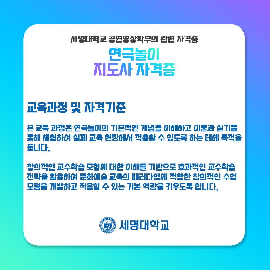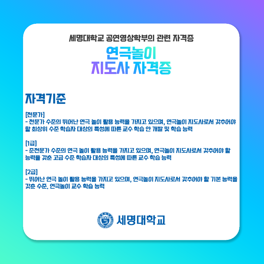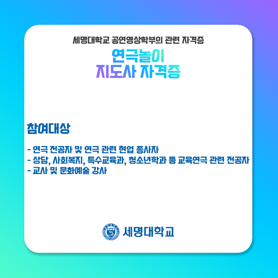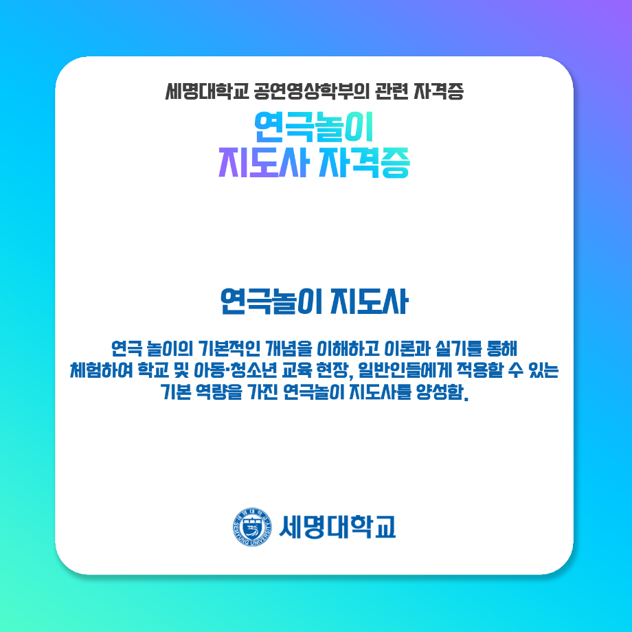 본문 시작 홈으로 학과과정 학과소개 입학정보 교수소개 학과과정 커뮤니티 공연예매 안내 홈페이지가이드 비교과프로그램 교육과정 전공교육 체계도 비교과프로그램 MOU 체결 연극놀이 지도사 양성 교육 하계, 동계 프로젝트 연극놀이 지도사 양성 교육 현장실습 프로그램 액팅플러스 연극놀이 지도사 양성 교육 페이스북 트위터 프린트 연극놀이 지도사 자격증 연기예술학과 4543 2022-01-15 세명대학교 연기예술학과에서는 학과생들을 위하여 매년 연극놀이지도사 자격증 취득을 위한 교육을 지원하고 있습니다. ㅤㅤ 한국임상연극심리치료협회의 지도하에 많은 학생들이 교육 과정을 이수하여 100%의 합격률을 자랑하고 있는 연극놀이지도사 자격증에 대하여 알려드립니다! 목록 다음 무대예술 전문인 자격증 만족도조사 만족도 조사 이 페이지에서 제공하는 정보에 대하여 만족하시나요? 매우만족 만족 보통 불만족 매우불만족