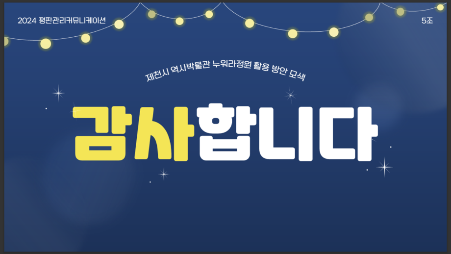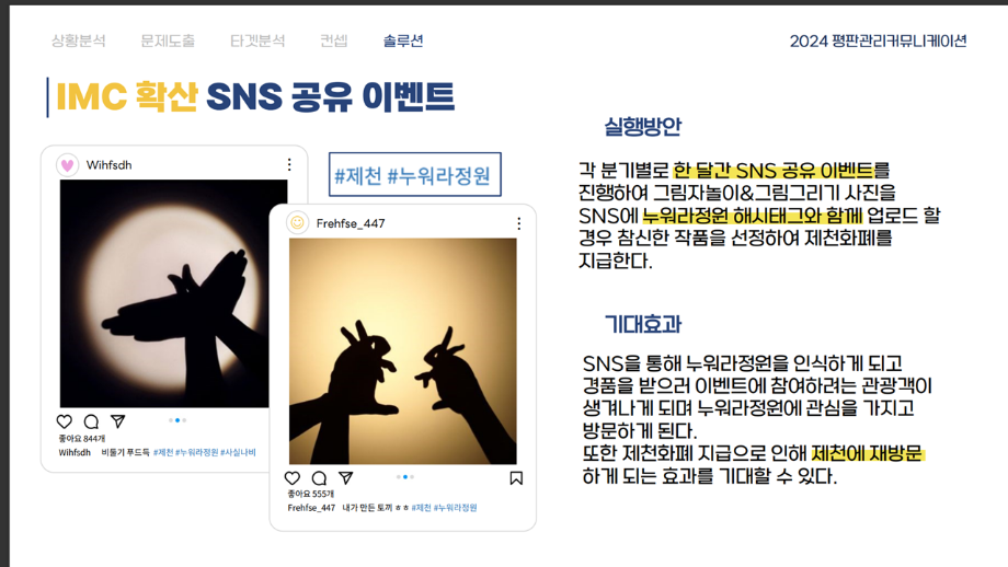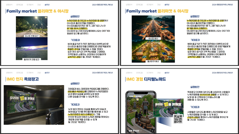 본문 시작 홈으로 흥미로운 교육과정 매력적인 학과소개 흥미로운 교육과정 특별CC프로그램 We can 취업 따뜻한 커뮤니티 홈페이지가이드 작품 갤러리 교육일정 교육과정 전공교육 체계도 졸업후진로 작품 갤러리 작품 갤러리 페이스북 트위터 프린트 [지역연계캡스톤디자인]제천의림지누워라정원발전방안기획 광고홍보학과 3555 2024-07-17 2024년 1학기 평판관리커뮤니케이션 수업 o 과제명 : 제천시 의림지 누워라 정원 발전 방안 o 프로그램 : 지역 연계 캡스톤디자인 수업 도시 브랜드 평판 관리 커뮤니케이션 전략입니다. ^^ 목록 이전[공공캠페인]서울시 공공디자인 공모전 수상작 다음 [사회과학조사방법론]키오스경험인식조사
