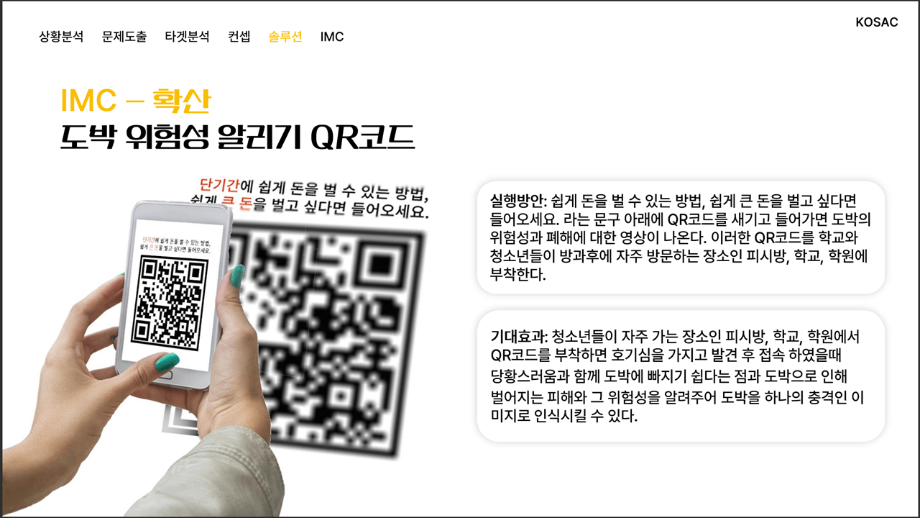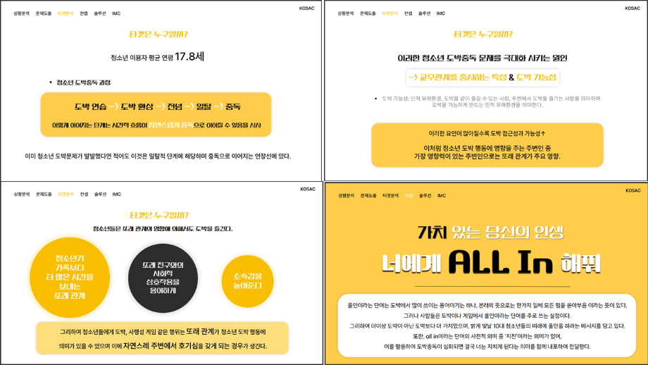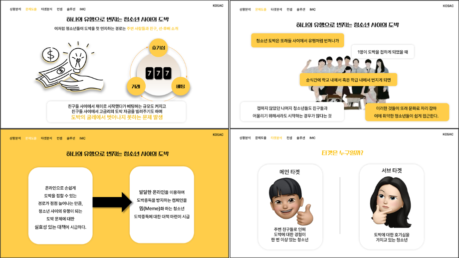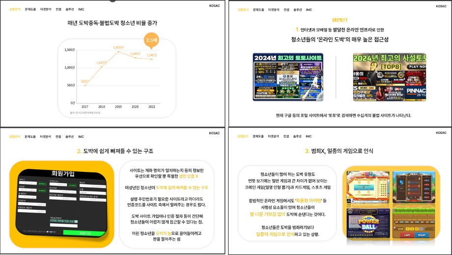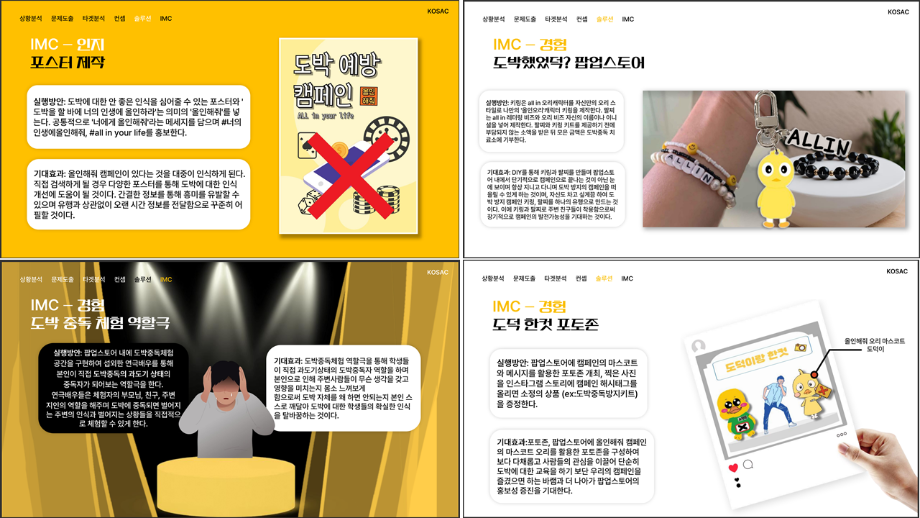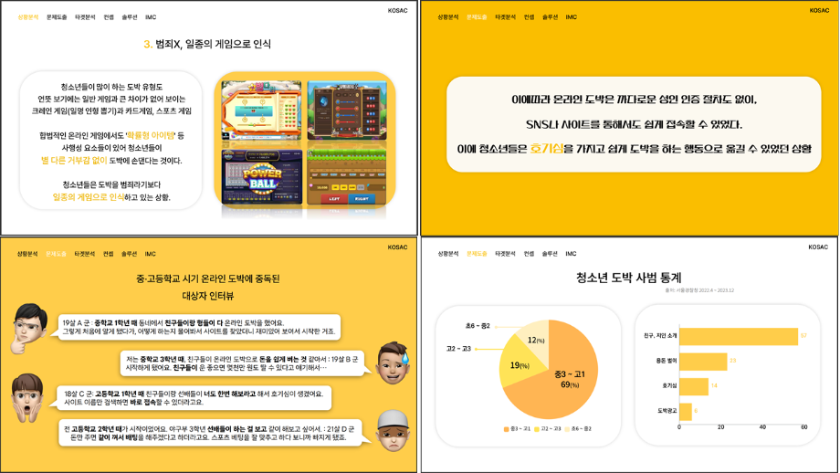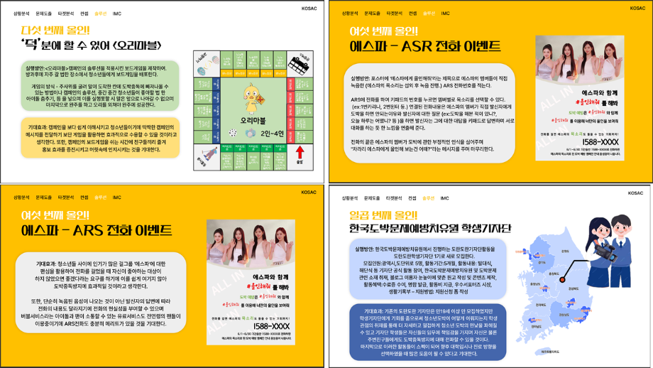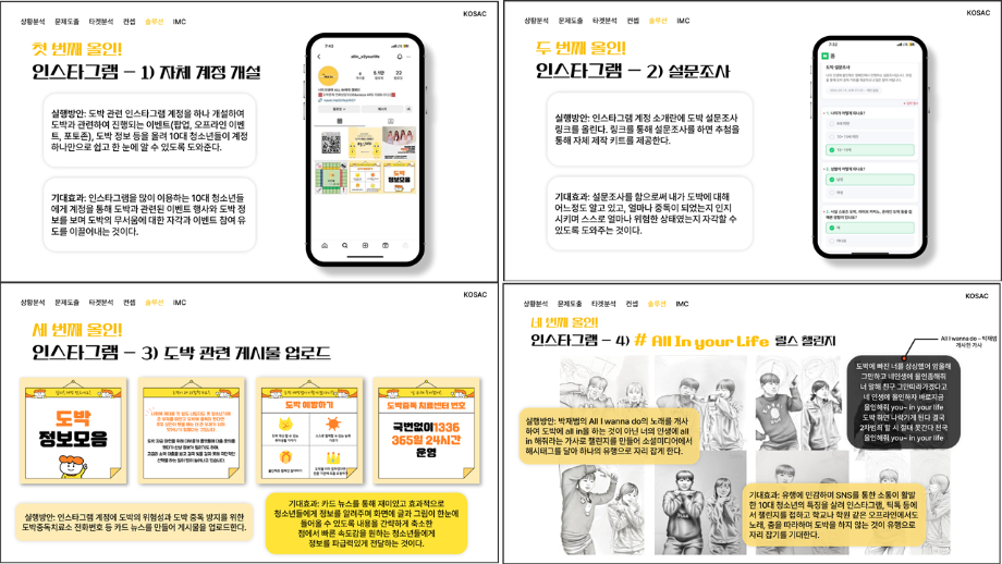 본문 시작 홈으로 흥미로운 교육과정 매력적인 학과소개 흥미로운 교육과정 특별CC프로그램 We can 취업 따뜻한 커뮤니티 홈페이지가이드 작품 갤러리 교육일정 교육과정 전공교육 체계도 졸업후진로 작품 갤러리 작품 갤러리 페이스북 트위터 프린트 [2024KOSAC]대한민국대학생광고대회 출품작 광고홍보학과 3813 2024-09-09 2024년도 대한민국 대학생 광고대회 출품작 주제 : 청소년 도박중독 방지를 위한 국민 참여 캠페인 제안서 세명대 광고홍보학과는 '기획맛집'을 지향하고, 이를 인정받고 있습니다 : ) 목록 이전[사회과학조사방법론]키오스경험인식조사 다음 [2024KOSAC]대한민국대학생광고대회 출품작