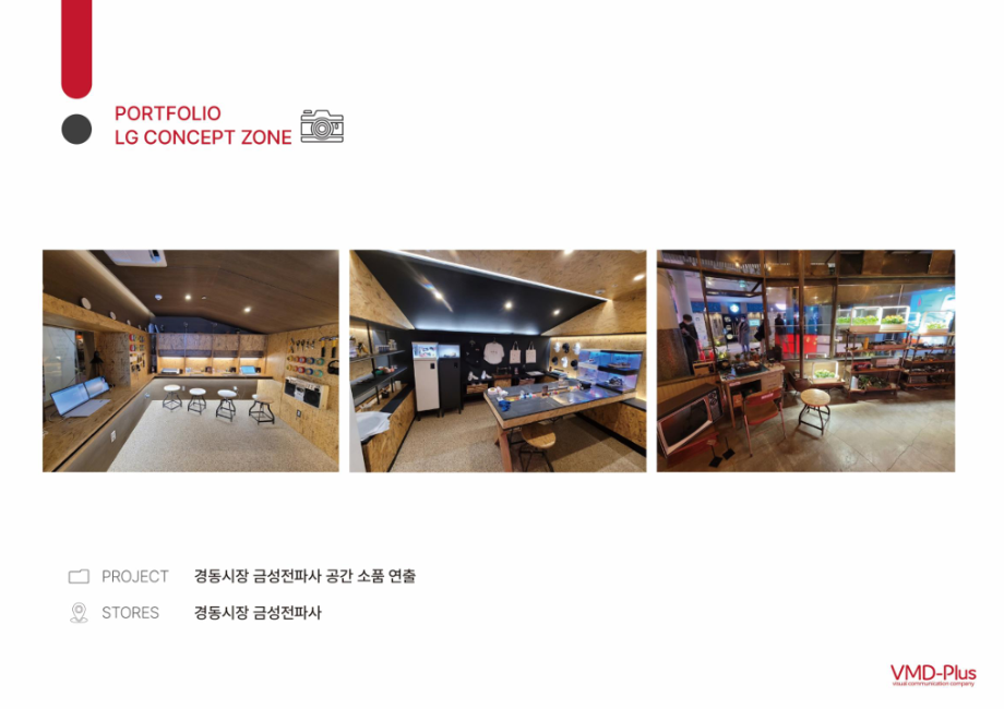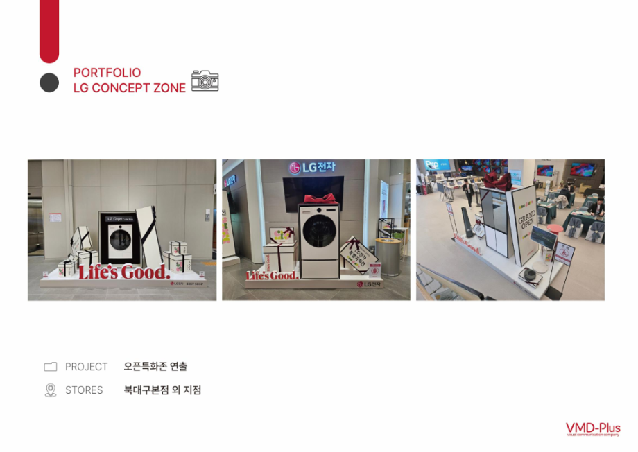브이엠디플러스는 LG전자 가전매장 연출을 담당하였던 VMD(visual merchandiser) 조직 구성원을 주축으로 국내 유일의 전자 관련 VMD 회사로 매장 연출 기획과 현장 실행을 주도하는 회사힙니다. LG전자의 도급사로서 판매 목적을 효율적으로 달성할 수 있도록 특정 상품이나 서비스를 시각적으로 연출하고 관리합니다.
