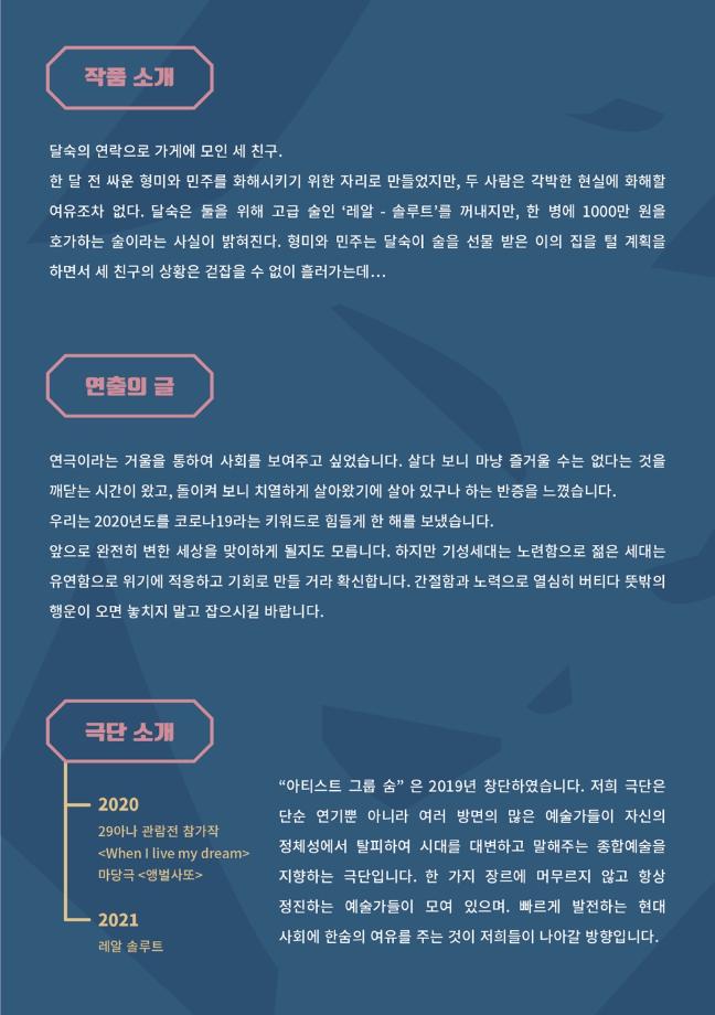 본문 시작 홈으로 학과소개 학과소개 입학정보 교수소개 학과과정 커뮤니티 공연예매 안내 홈페이지가이드 진로 학과개요 학과장인사말 학과연혁 세명대학교 민송아트홀 학과행사 진로 진로 페이스북 트위터 프린트 - 졸업생 창단 극단 ‘아티스트 그룹 숨’ 정기 공연 안내 연기예술학과 2182 2021-04-06 “일어나라, 자본주의의 반항아들아.” 🎓 졸업생 12학번 오기택 선배님이 창단한 [아티스트 그룹 숨] 두 번째 정기 공연작 <레알 솔루트> 🎓 일시 : 2021. 04. 06 (화) - 2021. 04. 18 (일) 목록 다음 졸업생 이현석 배우 국립극단 <무중력 연애 : 낭독 공연> 다음 졸업생 장하다, 극단 늘품의 ‘ 후설’ 무대 특별상 수상 만족도조사 만족도 조사 이 페이지에서 제공하는 정보에 대하여 만족하시나요? 매우만족 만족 보통 불만족 매우불만족