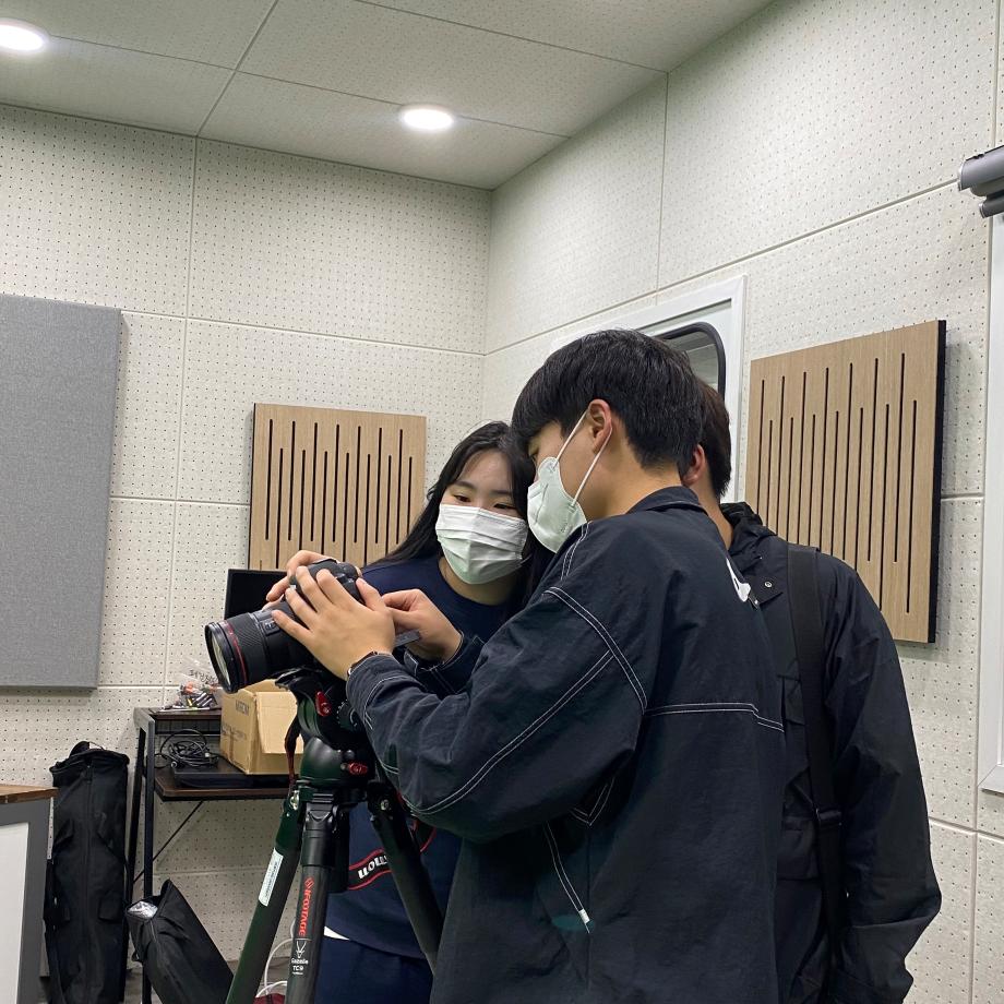 사진은 크로마키 스튜디오에서 학생들이 촬영 연습을 하는 모습이에요! 어때요? 미디어문화학부에서 영상을 만들어 보고 싶지 않으신가요?