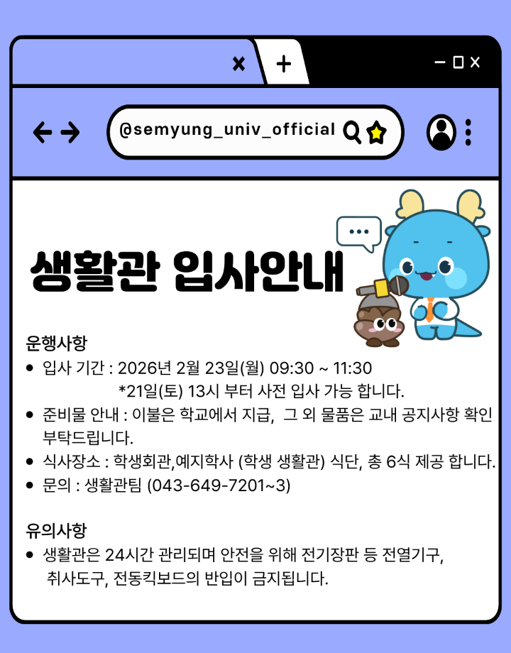 본문 시작 홈으로 커뮤니티 학과소개 교수소개 교육과정 커뮤니티 홈페이지가이드 포토갤러리 학과공지 학사일정 채용정보 및 자료 학생회 포토갤러리 포토갤러리 페이스북 트위터 프린트 2026학년도 신입생 '꿈 설계학기오리엔테이션' 안내 재난안전학과 368 2026-02-13 목록 이전세명대학교 2026학년도 정시모집 안내 다음 2026학년도 신입생 꿈설계학기 동영상 만족도조사 만족도 조사 이 페이지에서 제공하는 정보에 대하여 만족하시나요? 매우만족 만족 보통 불만족 매우불만족