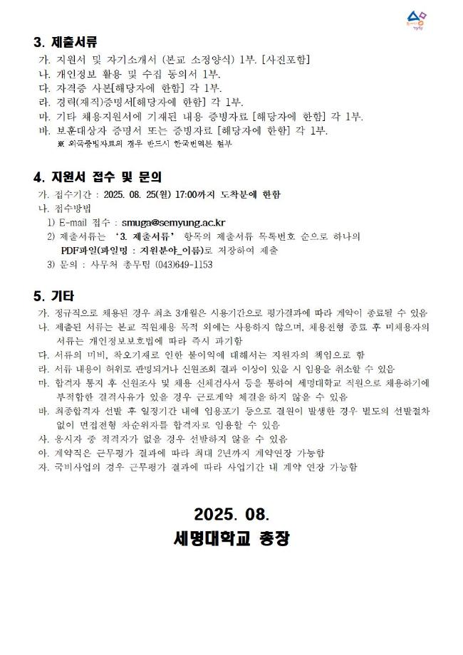 본문 시작 홈으로 커뮤니티 학과소개 교수소개 교육과정 커뮤니티 입학 정보 홈페이지가이드 취업/실습정보 학과공지 취업/실습정보 포토갤러리 취업/실습정보 페이스북 트위터 프린트 세명대학교 직원 채용 공고 [2025년 08월 25일 마감] 전기전자공학과 452 2025-08-14 목록 이전[(주)성풍건설] 채용 공고 다음 [알쓸신잡_2025년 8월 3주차] ●취업 및 일자리 정보 제공 안내문● 만족도조사 만족도 조사 이 페이지에서 제공하는 정보에 대하여 만족하시나요? 매우만족 만족 보통 불만족 매우불만족