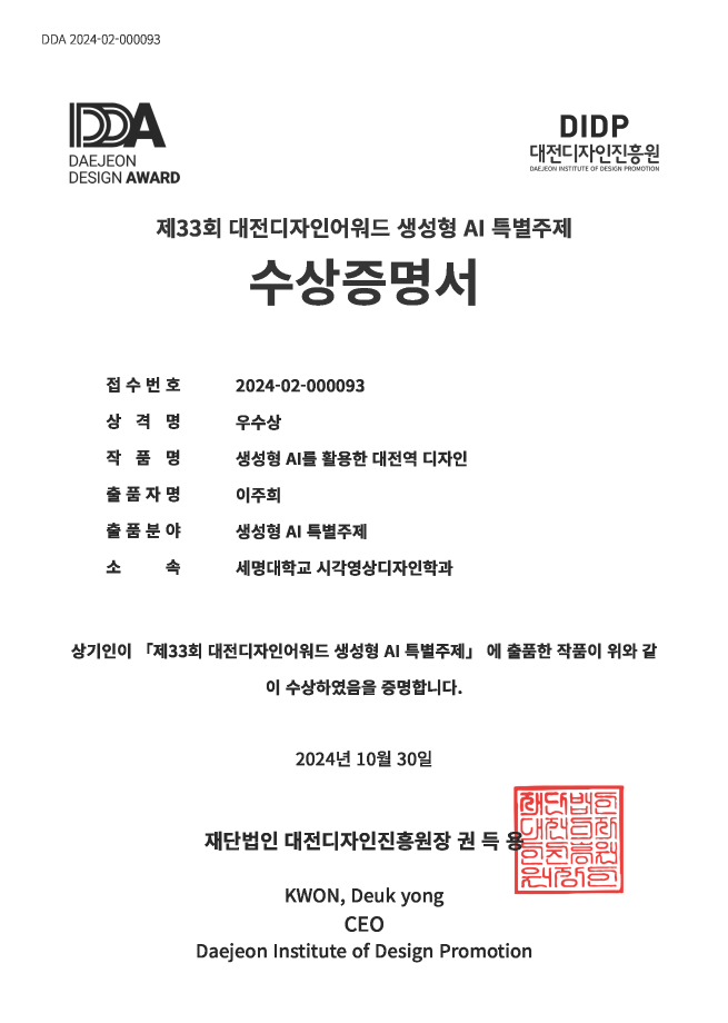 본문 시작 홈으로 학과자랑 학과소개 학과과정 시영소식 입학/취업 AI 학과자랑 SNS소통 홈페이지가이드 학과자랑 학과자랑 갤러리 공모전 동아리 졸업전시회 학과자랑 페이스북 트위터 프린트 제33회 대전디자인어워드-우수상 시각영상디자인학과 1658 2024-11-02 제33회 대전디자인어워드의 생성형 AI 특별주제부분에서 우수상(생성형 AI를 활용한 대전역 디자인-이*희학생)을 수상하였습니다 이밖에 고*호, 윤*환, 조*니학생이 특선 수상하엿습니다 목록 이전졸업생 인터뷰 - 20학번 졸업생 이*현 다음 시장 서비스러닝 / 벽화 서비스러닝 담당부서 : 시각영상디자인학과 담당자 : - 연락처 : 043-649-1726 최종수정일 : 2024-10-26 만족도조사 만족도 조사 이 페이지에서 제공하는 정보에 대하여 만족하시나요? 매우만족 만족 보통 불만족 매우불만족