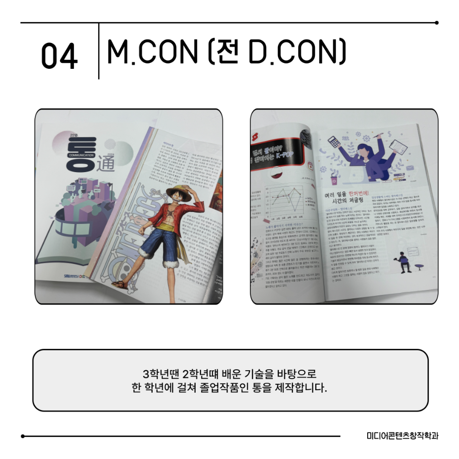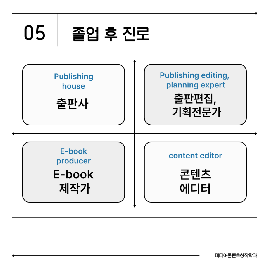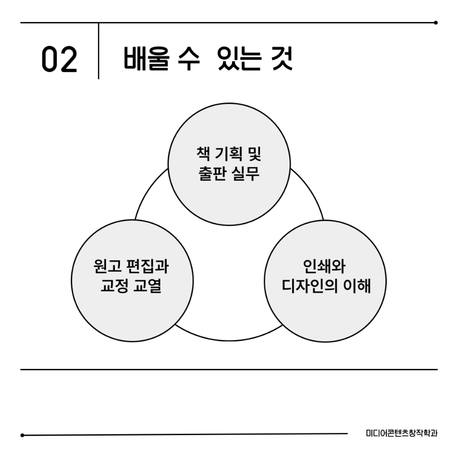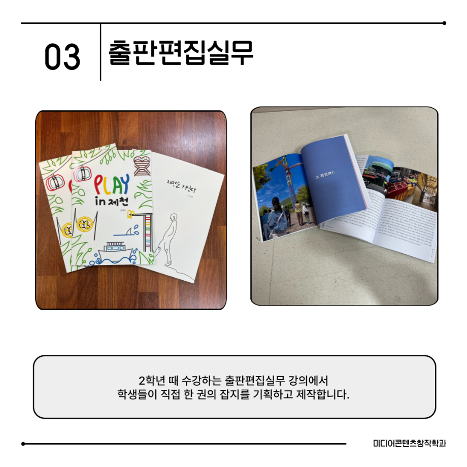 본문 시작 홈으로 MCC News 학과소개 교수소개 학과과정 MCC News MCC SNS 홈페이지가이드 미디어 정보통 학과 및 재학생 교수 및 졸업생 미디어 정보통 미디어 정보통 페이스북 트위터 프린트 📖미디어콘텐츠창작학과 | 출판 전공 미디어콘텐츠창작학과 1025 2025-08-19 출판 전공에서는 원고 편집, 기획, 디자인까지 책 제작의 모든 과정을 직접 경험합니다. 한 권의 책이 나오기까지는 수많은 손길이 필요합니다. 출판 전공은 글을 다듬고, 디자인하고, 기획하며 세상에 새로운 이야기를 전하는 과정을 배우는 곳입니다. 목록 이전경험이 실력이 되는 세명대학교 다음 📖 미디어콘텐츠창작학과 | 소설 전공 담당부서 : 미디어콘텐츠창작학과 담당자 : - 연락처 : 043-649-1741 최종수정일 : 2024-10-26 만족도조사 만족도 조사 이 페이지에서 제공하는 정보에 대하여 만족하시나요? 매우만족 만족 보통 불만족 매우불만족