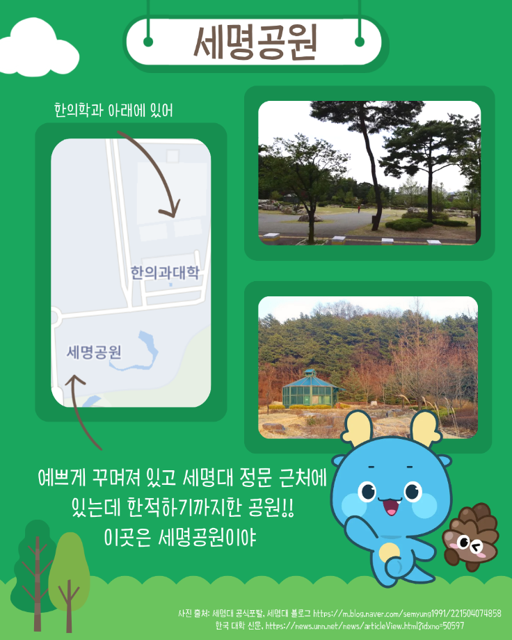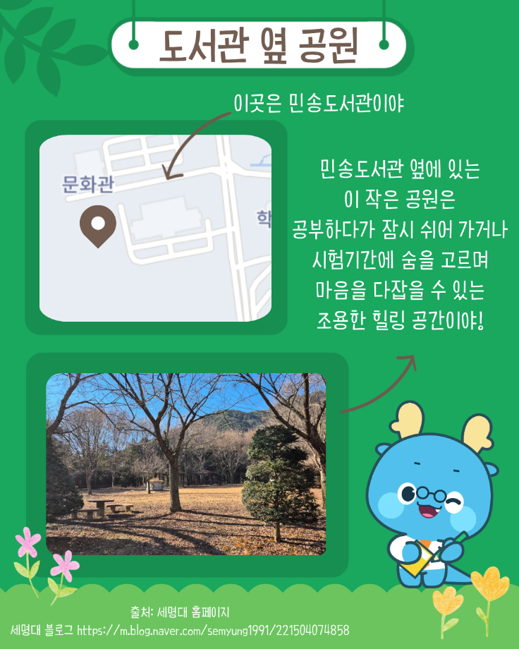 본문 시작 홈으로 MCC News 학과소개 교수소개 학과과정 MCC News MCC SNS 홈페이지가이드 미디어 정보통 학과 및 재학생 교수 및 졸업생 미디어 정보통 미디어 정보통 페이스북 트위터 프린트 세명대의 숨겨진 장소를 알려줄게! 미디어콘텐츠창작학과 895 2026-01-19 자세한 내용은 세명대학교 블로그에서 확인하실 수 있습니다. 목록 이전끄라몽 84회 CAT(고양이) 디자인 공모전 다음 2026년 제17회 장애인식개선 공모전 담당부서 : 미디어콘텐츠창작학과 담당자 : - 연락처 : 043-649-1741 최종수정일 : 2024-10-26 만족도조사 만족도 조사 이 페이지에서 제공하는 정보에 대하여 만족하시나요? 매우만족 만족 보통 불만족 매우불만족