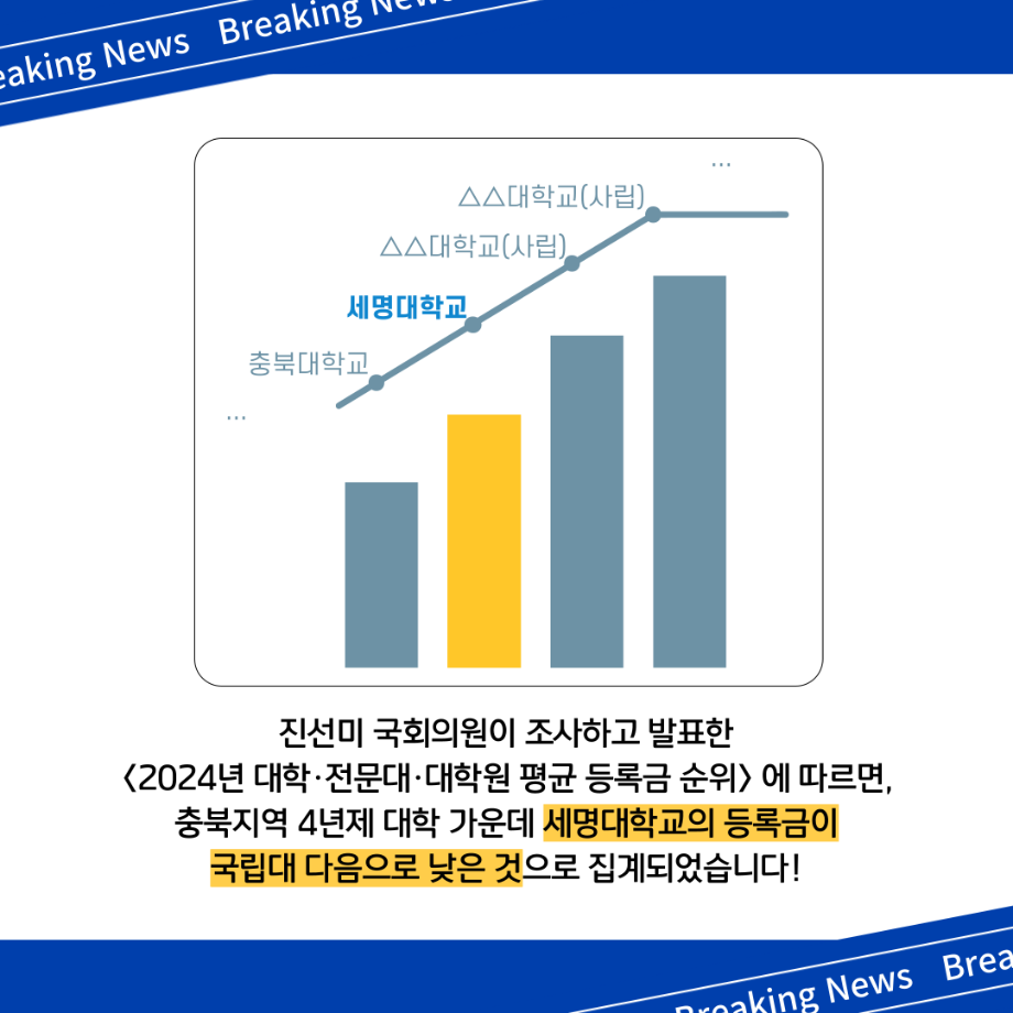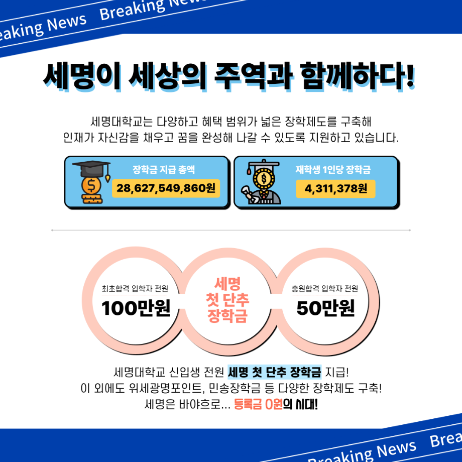 본문 시작 홈으로 MCC News 학과소개 교수소개 학과과정 MCC News MCC SNS 홈페이지가이드 미디어 정보통 학과 및 재학생 교수 및 졸업생 미디어 정보통 미디어 정보통 페이스북 트위터 프린트 💵 앗‼️ 세명대학교 등록금, 국립대 등록금 만큼 싸다?! 😮 미디어콘텐츠창작학과 3372 2024-09-10 진선미 국회의원이 조사하고 발표한 <2024년 대학, 전문대, 대학원 평균 등록금 순위>에 따르면, 충북지역 4년제 대학 가운데 ✨세명대학교의 등록금이 국립대 다음으로 낮은 것✨으로 집계되었습니다!😎 낮은 등록금에 더불어, 다양한 장학제도까지 구축된 세명대! 세명대학교 신입생 전원에게는 🧶세명 첫 단추 장학금🧶까지 지급한다고?! 세명은 바야흐로 등록금 0원의 시대! 장학금도 가득, 재미있는 경험도 가득한 세명대학교에서 만나요! 목록 이전📢 2024학년도 2학기 생활관 입사 일정 및 제출 서류 등록 안내 다음 [한국문학번역원] <2024 디아스포라 문학 예술행사> 개최 안내 담당부서 : 미디어콘텐츠창작학과 담당자 : - 연락처 : 043-649-1741 최종수정일 : 2024-10-26 만족도조사 만족도 조사 이 페이지에서 제공하는 정보에 대하여 만족하시나요? 매우만족 만족 보통 불만족 매우불만족
