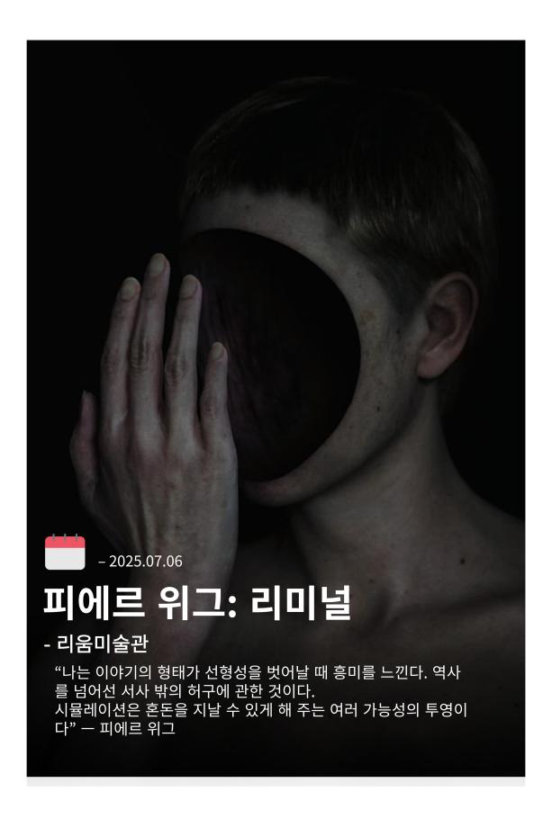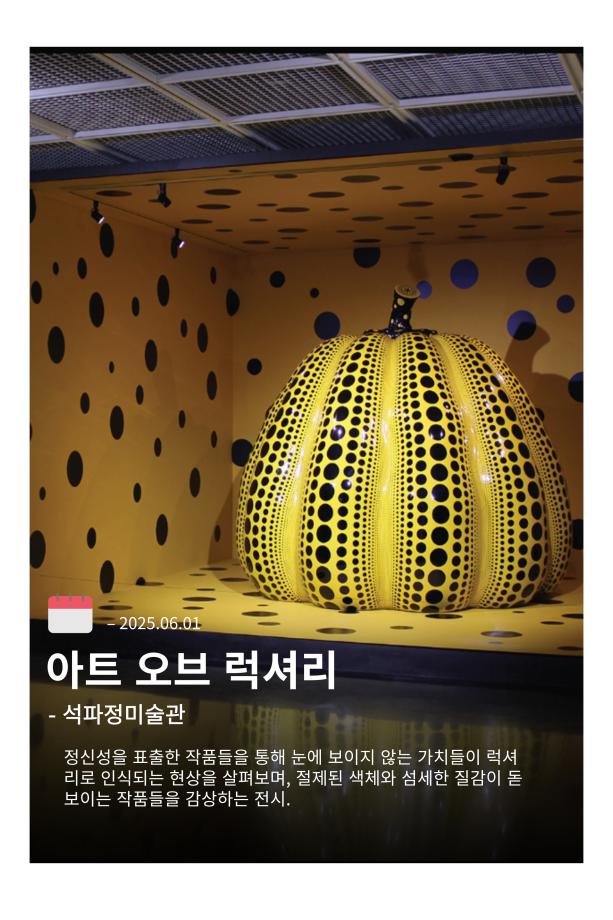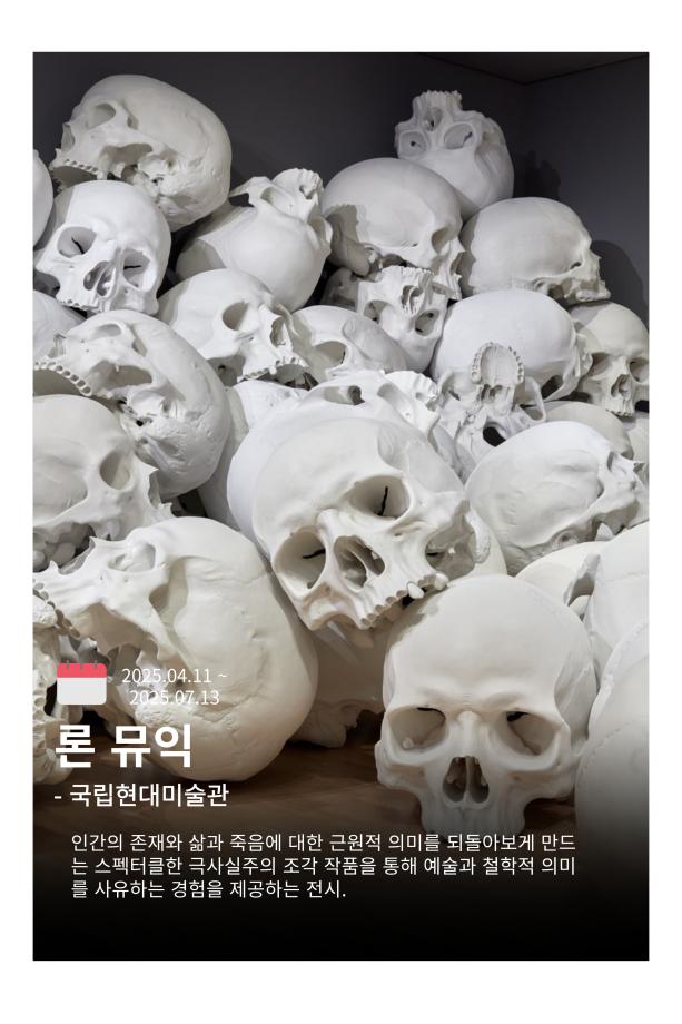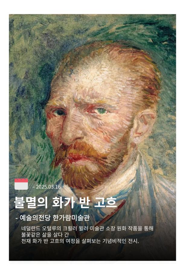 본문 시작 홈으로 MCC News 학과소개 교수소개 학과과정 MCC News MCC SNS 홈페이지가이드 미디어 정보통 학과 및 재학생 교수 및 졸업생 미디어 정보통 미디어 정보통 페이스북 트위터 프린트 우리과 학생이라면 한 번 가볼만한 전시회 추천!🫠 미디어콘텐츠창작학과 2200 2025-03-11 새학기도 시작한 기념으로 전시회도 한 번 갔다와보는건 어떨까요?🎨 1.불멸의 화가 반 고흐 2.피에르 위그:리미널 3.론 뮤익 4.아트 오브 럭셔리 5.인상파, 모네에서 미국으로 6.워너 브롱크호스트 추가적인 정보들은 학과 인스타그램을 참고해주세요! @SMU_MCC 목록 이전📚2025 광화문글판 대학생 에세이 공모전 (교보생명)✒ 다음 2025학년도 제천시장학금 신청 및 제천시 신규 전입 안내 담당부서 : 미디어콘텐츠창작학과 담당자 : - 연락처 : 043-649-1741 최종수정일 : 2024-10-26 만족도조사 만족도 조사 이 페이지에서 제공하는 정보에 대하여 만족하시나요? 매우만족 만족 보통 불만족 매우불만족