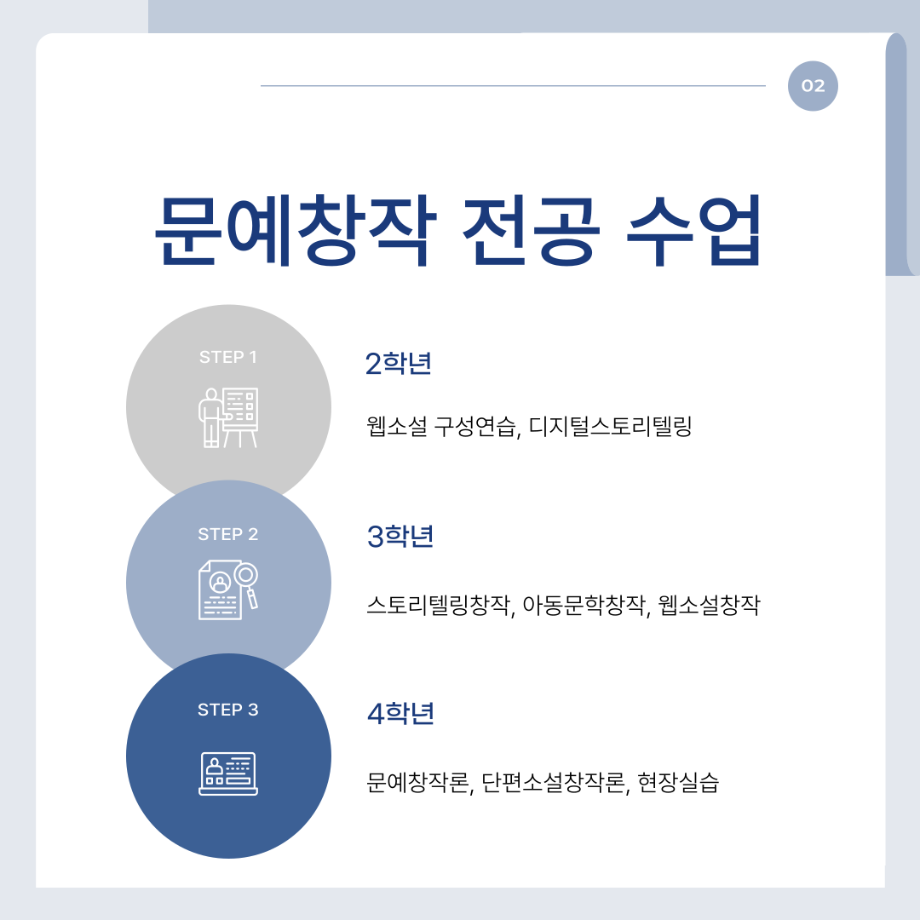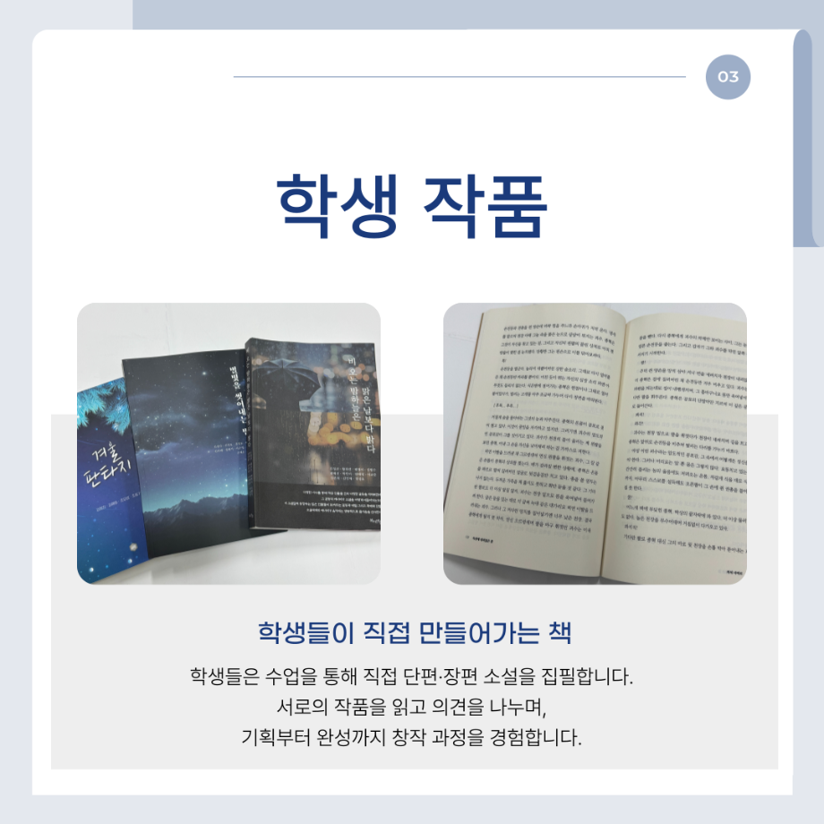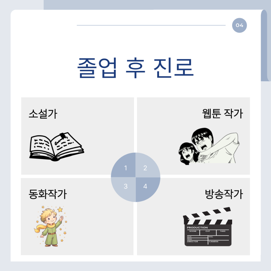 본문 시작 홈으로 MCC News 학과소개 교수소개 학과과정 MCC News MCC SNS 홈페이지가이드 미디어 정보통 학과 및 재학생 교수 및 졸업생 미디어 정보통 미디어 정보통 페이스북 트위터 프린트 📖 미디어콘텐츠창작학과 | 소설 전공 미디어콘텐츠창작학과 1138 2025-08-25 한 문장에 담긴 상상, 한 이야기로 완성되는 세계. 소설 전공에서는 기초 글쓰기부터 장르소설, 장편 창작까지 글쓰기의 전 과정을 배우며 실력을 쌓아갑니다. 작품 집필, 합평 수업, 출판 연계 활동을 통해 스토리텔링 능력과 창작 역량을 키우고, 작가·출판 기획자·콘텐츠 스토리텔러 등 다양한 진로로 나아갈 수 있습니다. 목록 이전📖미디어콘텐츠창작학과 | 출판 전공 다음 백억커피 x 곰믹스 AI 활용 영상 공모전 담당부서 : 미디어콘텐츠창작학과 담당자 : - 연락처 : 043-649-1741 최종수정일 : 2024-10-26 만족도조사 만족도 조사 이 페이지에서 제공하는 정보에 대하여 만족하시나요? 매우만족 만족 보통 불만족 매우불만족