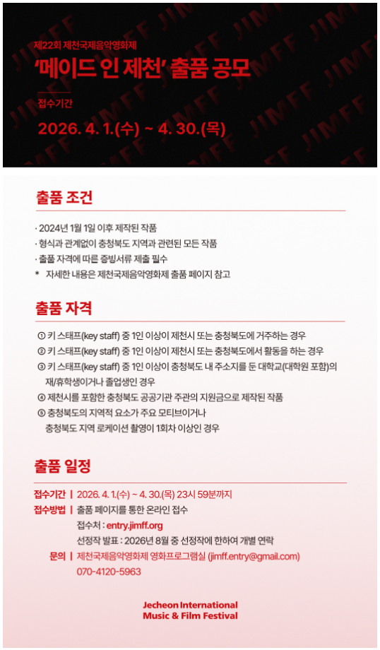 본문 시작 홈으로 학과소식 학과소개 교육과정 학과소식 학과작품 학과SNS 서울대학로 민송아트홀 홈페이지가이드 공모전 공지사항 학과뉴스 공모전 동아리 포토갤러리 공모전 페이스북 트위터 프린트 '메이드 인 제천' 출품 공모 영화웹툰애니메이션학과 10 2026-04-06 목록 이전충북 대학생 문화·관광 홍보영상 제작 공모전 만족도조사 만족도 조사 이 페이지에서 제공하는 정보에 대하여 만족하시나요? 매우만족 만족 보통 불만족 매우불만족