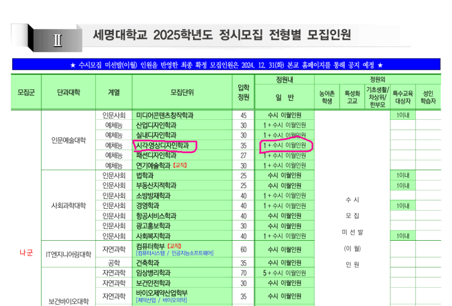 세명대학교 2025학년도 정시[나군/다군] 모집요강을 공지하오니,
