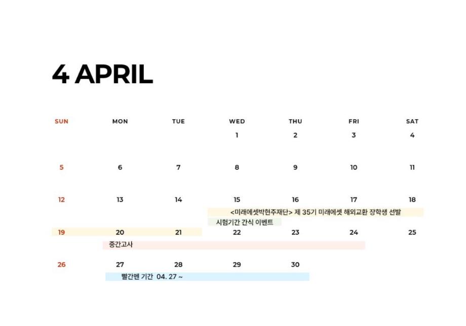 본문 시작 홈으로 학과 커뮤니티 학부소개 교수소개 교육목표 입학안내 학과 커뮤니티 대학원 커뮤니티 홈페이지가이드 학과 갤러리 학과소식 학사일정 학과 갤러리 학과 갤러리 페이스북 트위터 프린트 4월 학사일정 상담심리학과 23 2026-04-17 안녕하세요 세명대학교 상담심리학과입니다! 4월 학사일정 안내드립니다. 4/20(월)~24(금)은 중간고사 기간입니다. 노력한 만큼 좋은 결과 있길 바랍니다 :) 목록 이전Shine-up 동아리 봉사 활동 다음 심리극과 연극치료 학술특강 만족도조사 만족도 조사 이 페이지에서 제공하는 정보에 대하여 만족하시나요? 매우만족 만족 보통 불만족 매우불만족