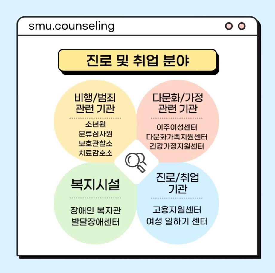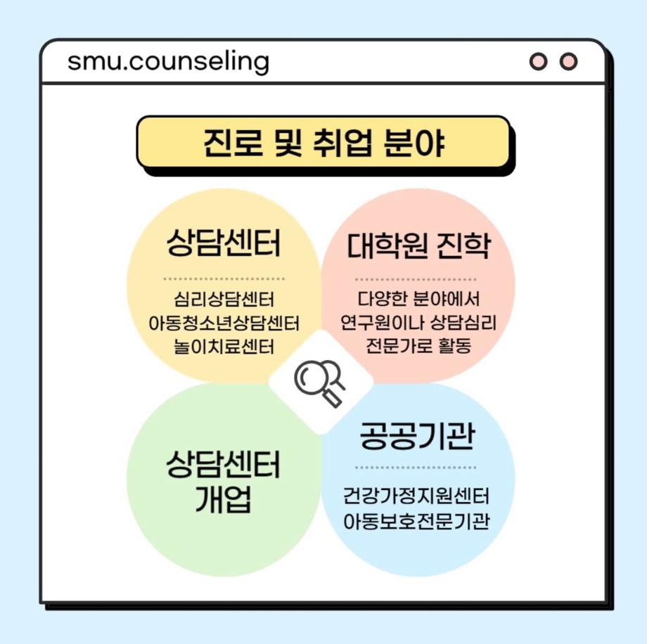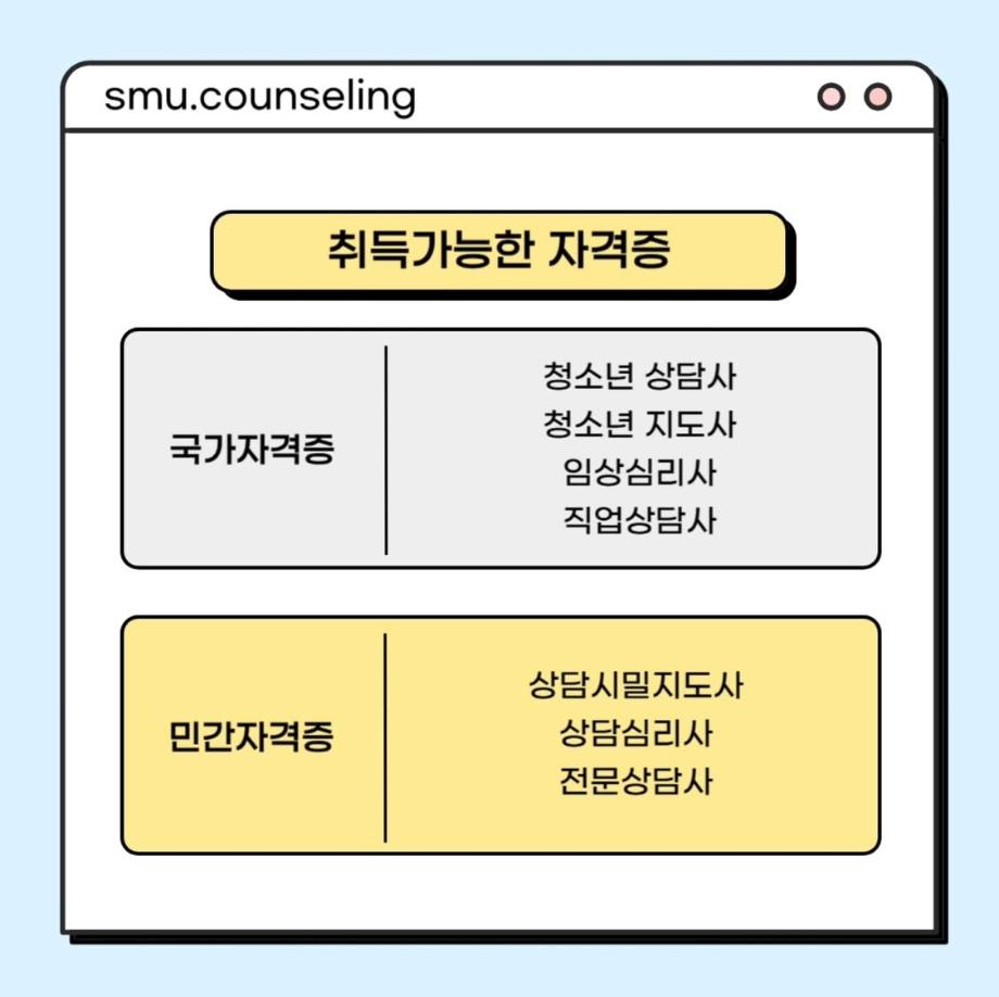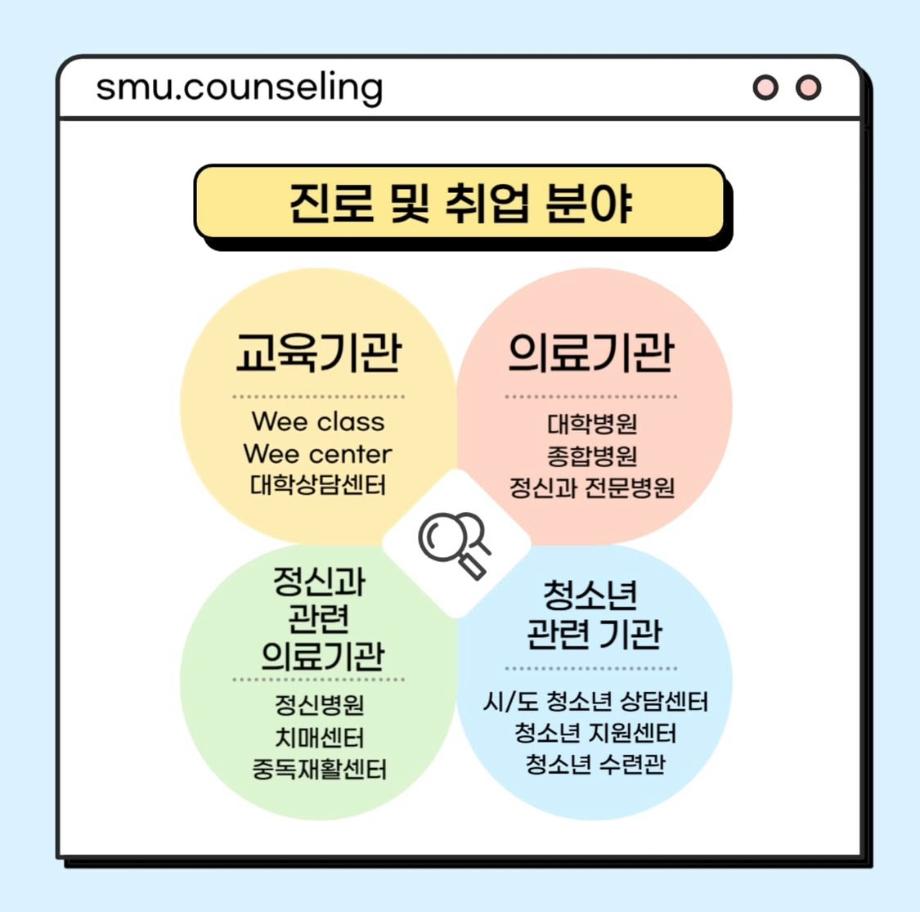 본문 시작 홈으로 학과 커뮤니티 학부소개 교수소개 교육목표 입학안내 학과 커뮤니티 대학원 커뮤니티 홈페이지가이드 학과 갤러리 학과소식 학사일정 학과 갤러리 학과 갤러리 페이스북 트위터 프린트 자격증&진로 소개 상담심리학과 749 2025-07-30 안녕하십니까 세명대학교 상담심리학과입니다! 오늘은 상담사가 되기 위해 필요한 자격증, 취업 분야를 소개해드리려고 합니다. 상담심리학과 졸업 후에는 교육기관, 의료기관, 복지시설 등 다양한 분야에서 활동할 수 있습니다 :) 목록 이전[현직자 인터뷰] 평창군청소년상담복지센터 다음 [현직자 인터뷰] 육군 상담사 만족도조사 만족도 조사 이 페이지에서 제공하는 정보에 대하여 만족하시나요? 매우만족 만족 보통 불만족 매우불만족