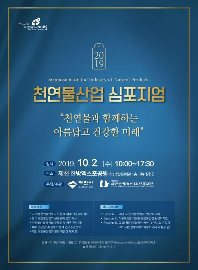 제천한방바이오진흥재단은 오는 10월 2일 오전 10시 제천한방엑스포공원 한방생명과학관에서 2019제천한방바이오박람회(10. 2. ~ 10. 7.)의 학술행사로 ‘천연물과 함께하는 아름답고 건강한 미래’를 주제로 심포지엄을 개최한다.